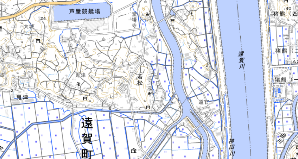 西南、鬼津村界より流れ来たり。村の東を過ぎて、芦屋村界に入る【按ずるに、旧記に鬼津と若松の間に堀川あり。寛永五年、水害除きのために掘ると見えたり。里民に問うに、此川の末にて島津・若松両村の抱えなるべしと云え共不詳】。長四百九十間。幅十二間。平水二尺。満水六尺。板橋一所【川尻】